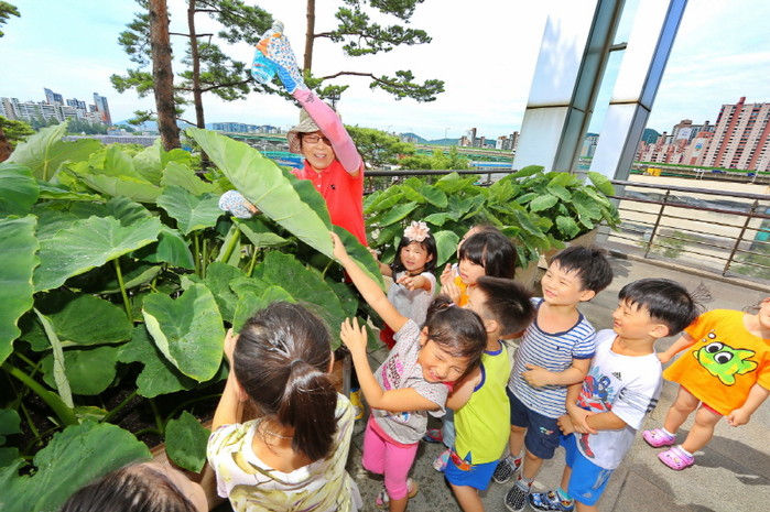 최근 서울 금천구는 새라어린이집 원생 31명을 초청해 구청 옥상텃밭에서 '구청텃밭 생태투어'를 실시했다. 사진은 어린이들이 연꽃을 살펴보고 있는 모습.(사진제공=금천구청)