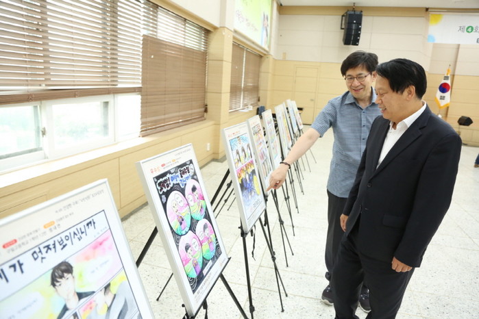 최근 서울 구로구는 구청 강당에서 지난달 지역내 초·중·고등학생을 대상으로 실시했던 '건강한 구로! 4컷 만화 포스터 공모전'의 시상식을 개최했다. 사진은 이성 구청장(오른쪽)이 당선작을 살펴보는 모습.(사진제공=구로구청)