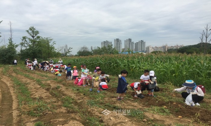 최근 경기 안산시청공무원노동조합은 지역내 직장어린이집의 원아 100여명을 주말농장에 초청해 '감자 수확 체험행사'를 개최했다. 사진은 어린이들이 감자를 직접 캐고 있는 모습.(사진제공=안산시청)