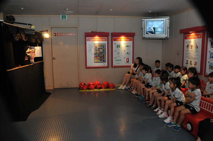 지난 18일 서울 동작소방서는 소방안전체험교실에서 '벧엘유치원' 어린이 및 교사들을 대상으로 소방안전교육을 실시했다. 사진은 어린이들이 소방안전에 관한 인형극을 관람하는 모습.(사진제공=동작소방서)