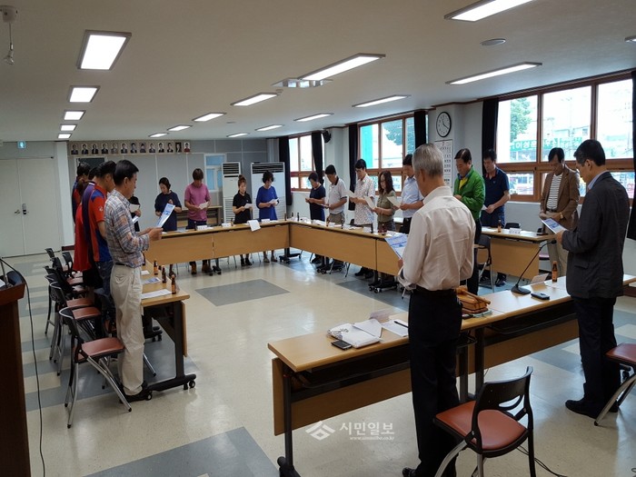 지난 18일 경기 이천시 관고동은 동주민센터 회의실에서 '참시민 이천행복나눔운동 실천 결의대회'를 개최하고 주민자치위원으로서 역할을 다할 것을 다짐했다. 사진은 위원들이 결의대회를 진행하고 있는 모습.(사진제공=이천시청)