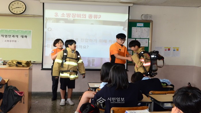 지난 19일 서울 영등포소방서는 여의도동 윤중중학교에서 학생 20명을 대상으로 소방공무원 직업체험교육을 실시했다. 사진은 학생들이 소방복과 소방장비를 착용하는 모습.(사진제공=영등포소방서)