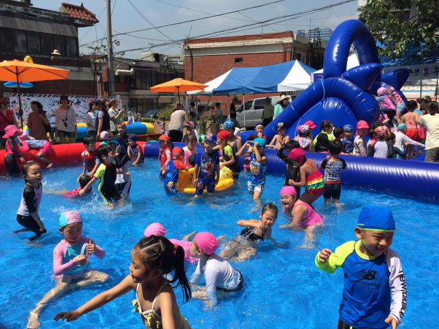 | ▲ 지난 19일 독산4동에서 개장한 '골목길 물놀이장'에서 어린이들이 물놀이를 즐기고 있다. | ||