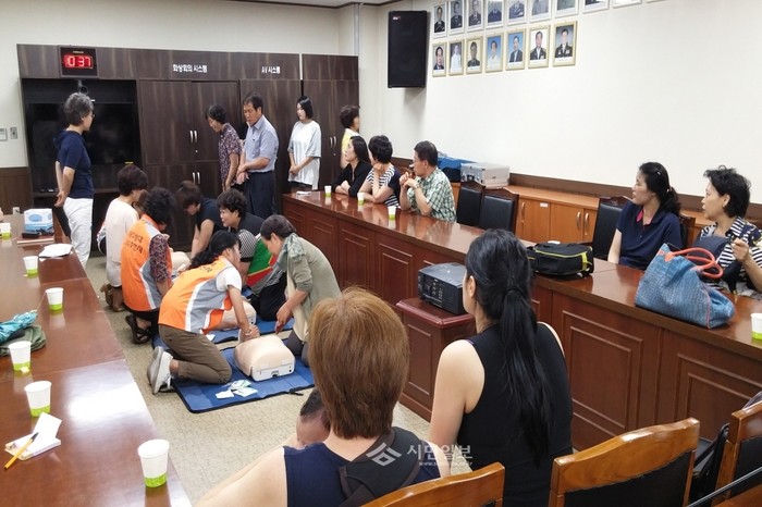 지난 20일 경기 동두천시 송내동 주민자치위원회는 동두천소방서와 함께 '나도 할 수 있다. 심폐소생술!'이라는 주제로 소방서 회의실에서 주민자치프로그램 수강생을 대상으로 '심폐소생술 교육'을 실시했다.(사진제공=동두천시청)