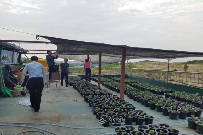 지난 19일 경기 수원시 팔달구 고등동에서는 마을만들기협의회와 고등동주민자치위원회가 함께 동주민센터 옥상에서 국화 재배에 필요한 햇빛량을 조절하기 위해 차양막을 설치했다.(사진제공=팔달구청)