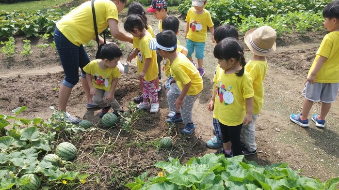 지난 20일 서울 서초구는 꽃초롱 자연학습장에서 인근 지역 어린이들을 대상으로 토마토, 가지 등 열매채소와 옥수수를 직접 수확하고 맛 보는 농업체험행사를 개최했다. 사진은 어린이들이 수박 수확체험을 하는 모습.(사진제공=서초구청)