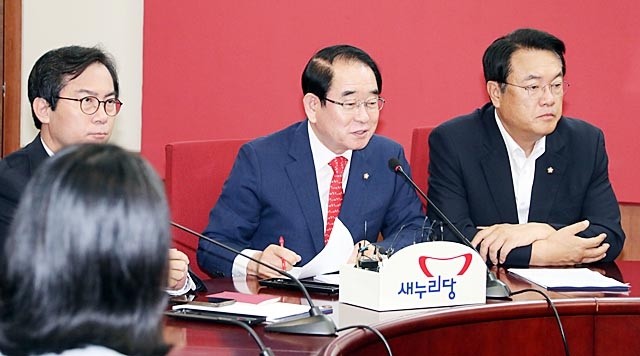 새누리당 박명재 사무총장이 21일 오전 서울 여의도 당사에서 열린 혁신비상대책위원회 회의에서 더불어민주당 우상호 원내대표가 새누리당 당권 주자들을 ‘개나 소’에 비유한 데 대해 “농담이라고 하기엔 너무 고약하고, 농담의 수준이 제1야당 원내대표라는 분의 정치적 상식과 수준을 의심케 한다”고 비판하고 있다.