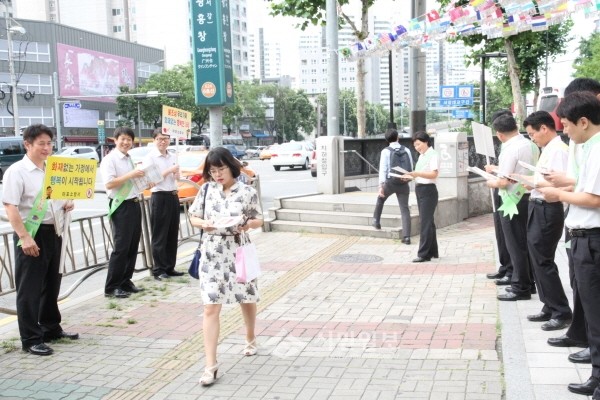 21일 서울 마포소방서는 오전 광흥창역에서 기초 소방시설 설치 촉진 캠페인을 실시했다. 사진은 소방서 관계자들이 시민들에게 홍보 전단지를 배부하는 모습.(사진제공=마포소방서)