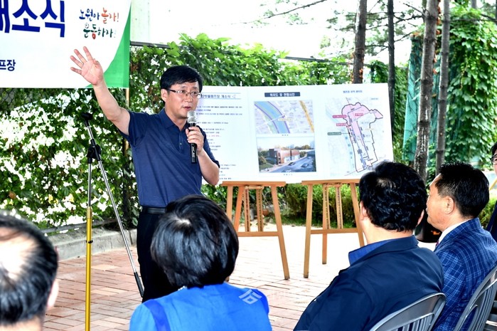 김성환 서울 노원구청장이 최근 공릉동 중랑천 한천교 인근에 들어선 공릉제2빗물펌프장 개소식에 참석해 주민들에게 빗물펌프장 현황을 설명하고 있다.(사진제공=노원구청)