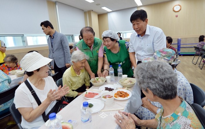 최근 서울 동대문구 제기동 주민센터는 지역내 저소득 노인 300명을 동주민센터 4층으로 초청해 '제기동 복달임 삼계탕 나눔 행사'를 개최했다. 사진은 관계자들이 노인들에게 삼계탕을 대접하고 있는 모습.(사진제공=동대문구청)