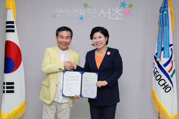 | ▲ 조은희 구청장(오른쪽)과 고도원 (재)아침편지문화재단 이사장(왼쪽)이 아버지센터 운영을 위한 업무협약(MOU)을 체결하고 기념촬영하고 있다. | ||