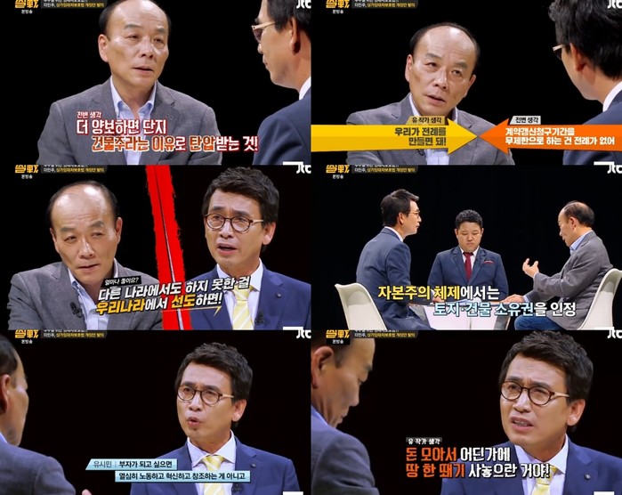이에 유시민은 "더 양보해야된다"고 했고,전원책은 "더 양보하면 단지 건물주라는 이유로 탄압을 받는 것이다"라고 말했다.