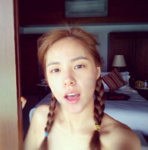 사진 속 민효린은 침대 위에서 노메이크업에 양갈래로 머리를 딴 채 카메라를 응시하고 있다.