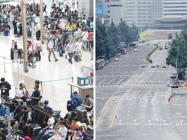 본격 여름방학과 휴가철을 맞아 인천공항을 이용한 여행객이 역대 최다를 기록할 것으로 예상되는 가운데 24일 오후 인천국제공항 출국장에 많은 여행객이 북적이고 있다(왼쪽). 이와는 대조적으로 여름 휴가철이 시작된 24일 서울 숭례문 인근 도로는 한산한 모습을 보이고 있다.