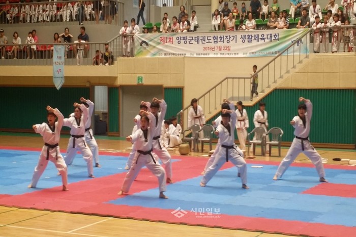 지난 23일 경기 양평군은 물맑은양평체육관에서 관계자 및 670여명의 선수가 참석한 가운데 '제1회 양평군 태권도협회장기 생활체육대회'를 성황리에 개최했다. 사진은 선수들이 품새 경기를 펼치는 모습.(사진제공=양평군청)