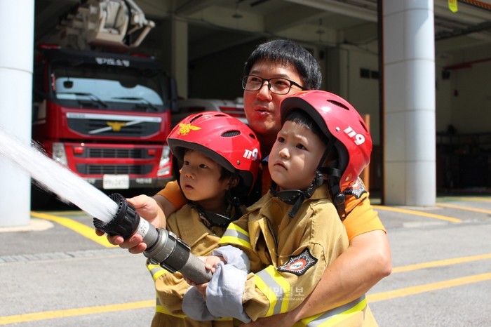 최근 경기 이천소방서는 이화어린이집 원생 60명을 대상으로 어린이 눈높이에 맞는 '맞춤형 소방안전체험교육'을 실시했다. 사진은 어린이들이 소방호스 사용 실습을 하는 모습.(사진제공=이천소방서)