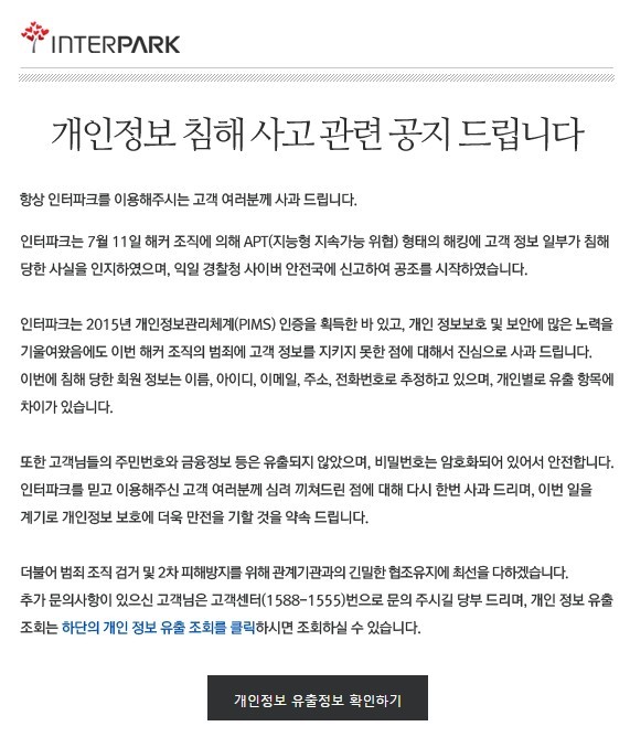인터파크 측은 지난 25일, 경찰청 사이버안전국을 통해 5월 데이터베이스 서버가 해킹돼 약 1030만여명의 아이디와 이름, 전화번호, 생년월일, 이메일 주소 등 개인 정보가 유출된 것을 수사중이라고 밝혔다. 또한 팝업 공지를 통해 개인정보 유출을 확인할 수 있도록 조치했다.
