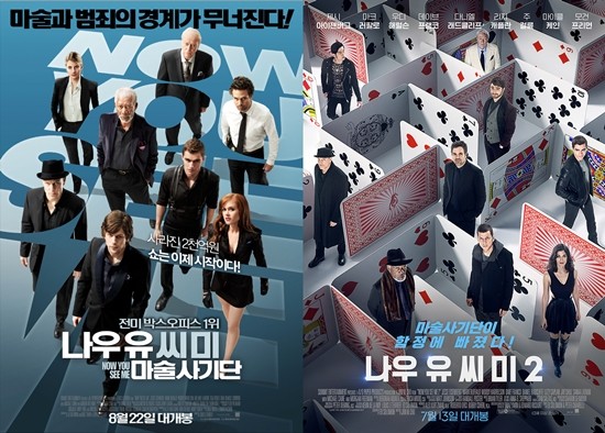 첫 번째 비교 항목은 바로 캐스팅. 마크 러팔로, 마이클 케인, 모건 프리먼 등이 전편에 이어 출연한다. 제시 아이젠버그, 우디 해럴슨, 데이브 프랭코, 아일라 피셔로 이루어졌던 마술사기단 멤버 중 아일라 피셔가 리지 캐플란으로 교체됐다. 기존 마술사기단 멤버들과는 조금 다른 스타일의 기괴한 마술을 선보이며 4차원 매력을 뽐낸 리지 캐플란은 전작 팬들로부터도 크게 환영 받으며 시리즈 구성원으로 안착에 성공했다.