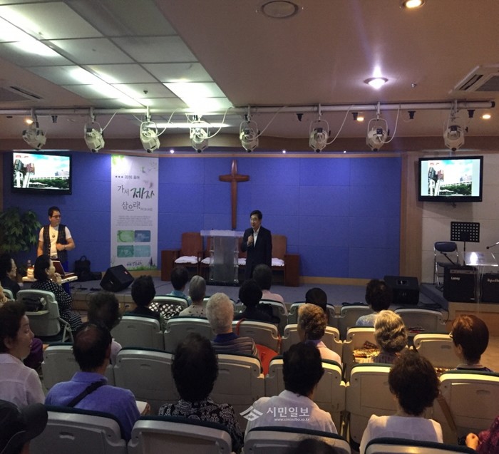 최근 서울 도봉구 쌍문1동에 위치한 민간복지거점기관인 진흥교회에서 70여명의 노인을 대상으로 ‘지역어르신과 함께하는 노래교실 행사’를 개최했다. 사진은 행사에 방문한 이동진 구청장이 축사를 하는 모습.(사진제공=도봉구청)