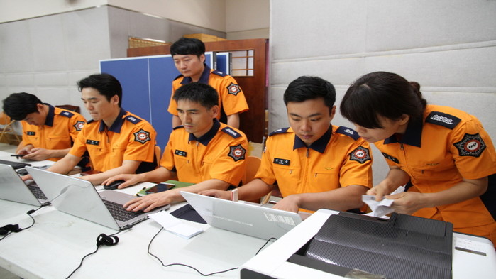 최근 동작소방서는 3층 강당에서 각종 재난 발생에 따른 신속한 현장대응 능력을 높이기 위해 2016년 불시 긴급구조통제단 가동훈련을 실시했다. 사진은 소방관들이 훈련에 집중하는 모습.(사진제공=동작소방서)