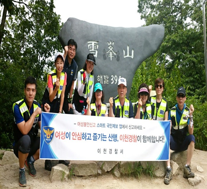 지난 24일 경기 이천경찰서는 여성범죄 대응 특별치안대책 일환으로 지역명산인 설봉산 등산로 일대 범죄취약 지점에 대한 예방진단을 실시했다. 사진은 경찰서 관계자들이 기념촬영하는 모습.(사진제공=이천경찰서)