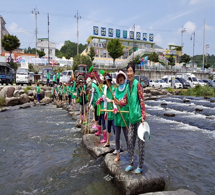최근 전남 장흥군새마을회는 새마을부녀회, 새마을지도자장흥군협의회 등 유관단체의 마을가족 40여명과 함께 정남진 물축제의 성공적인 개최를 위한 징검다리 정화활동을 실시했다. 사진은 정화활동 참가자들이 징검다리를 닦고 있는 모습.(사진제공=장흥군청)