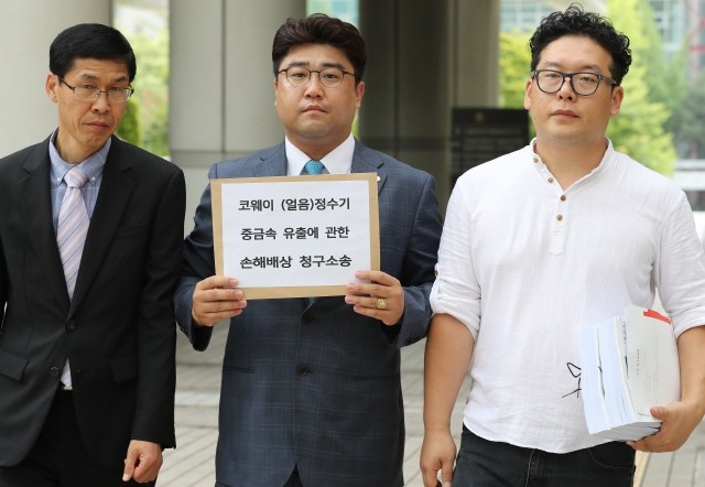 코웨이 (얼음) 정수기 중금속 유출에 관한 손해배상청구 소송 접수를 위해 26일 오전 엄원식 코웨이 피해소송모임 대표(오른쪽)와 남희웅 변호사(왼쪽) 이진형 사무장이 서울중앙지법 민원실로 들어서고 있다.