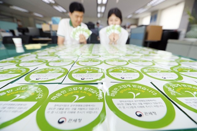 관세청이 일명 ‘김영란법(부정청탁금지법)’ 시행에 미리 대비해 공무원들에게 배달된 선물을 돌려줄 때 상자에 부착하는 이른바 ‘청렴스티커’를 5000매 제작해 배포했다. 26일 관세청 직원이 청렴스티커를 들어보이고 있다.