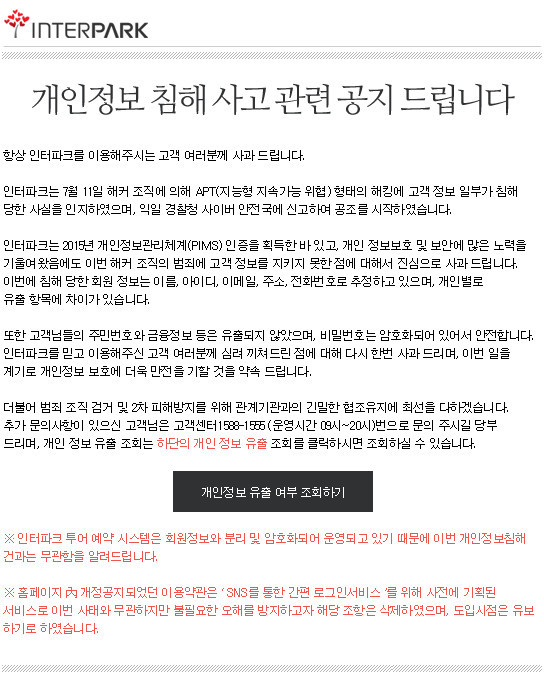 관련 업계에 따르면 인터파크 개인정보 유출은 지난 5월 국적을 파악할 수 없는 해커에 의해 발생했으며 파악된 피해 규모는 회원 약 1030만 명의 개인 정보 유출이다.
