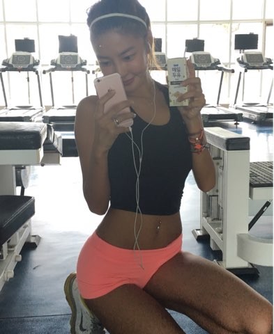 이날 공개된 사진 속에서 NS윤지는 운동을 마친 뒤 매일두유를 마시며 셀카를 찍고 있다.
