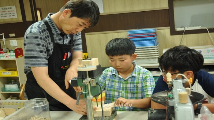 지난 25일 경기도연천교육지원청 부설 영재교육원은 교육지원청 1층 과학실에서 지역내 초·중학교 영재교육원 대상자 중 희망자 25명을 대상으로 '여름방학 특강'을 열었다. 사진은 '오토마타 만들기'에 참여한 학생들이 목재를 다듬는 모습.(사진제공=경기도연천교육지원청)