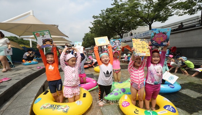서울 송파구가 오는 8월3일까지 성내천 물놀이장에서 운영하는 이색도서관 ‘피서지 문고’를 찾은 아이들이 자신이 좋아하는 책을 꺼내 머리 위로 들어 보이고 있다.(사진제공=송파구청)