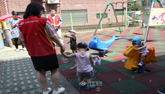 최근 서울 노량진 아동보육시설 서울성로원을 방문한 서울지방우정청 우정사회봉사단이 ‘1일 부모’가 돼 비눗방울총을 쏘며 노는 아이들과 즐거운 시간을 보내고 있다.(사진제공=서울지방우정청)