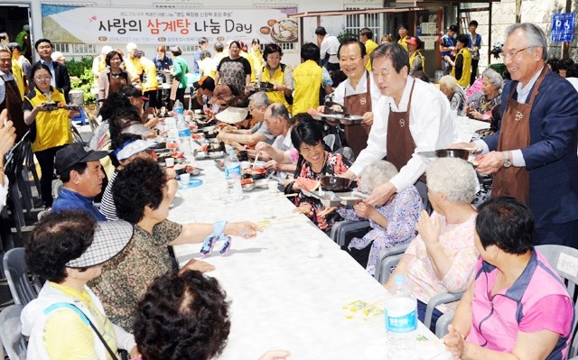 김무성 전 새누리당 대표가 27일 부산 영도구 절영종합사회복지관에서 노인에게 삼계탕을 배식하고 있다. 이날 영도 거주 노인 3천명을 대상으로 한 삼계탕 대접은 신정택 세운철강 회장이 5000만원을 쾌척해 이뤄졌다. 휴가 중인 김 전 대표는 부산에서 가족과 시간을 보낸 뒤 31일 전남 해남 땅끝마을을 시작으로 전국을 돌아다니며 민심을 듣는 대장정을 한다.