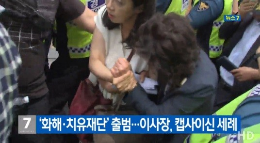 김태현 위안부 피해자 지원 재단(화해.치유재단) 이사장이 28일 재단 출범 기자 간담회에 참석 후 돌아가는 길에 한 남성으로부터 캡사이신을 맞았다.