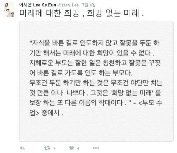 이세은은 최근 자신의 인스타그램에 "미래에 대한 희망, 희망 없는 미래"라는 글과 함께 '부모 수업'구절의 사진을 게재했다.