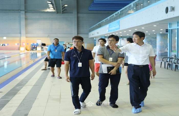 최근 경기 오산시시설관리공단은 여름 휴가철을 맞이해 수영장 안전사고를 선제적으로 예방하기 위해 스포츠센터(수영장)에 대한 특별점검과 현장 안전교육을 실시했다. 사진은 관계자들이 수영장 시설을 둘러보는 모습.(사진제공=오산시청)