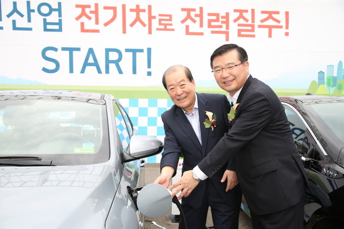 지난 2일 박홍섭 서울 마포구청장은 상암 월드컵경기장에서 개최한 전기차 충전소 착공식에 참석했다. 사진은 박 구청장(왼쪽)이 류경기 서울시 행정1부시장과 함께 전기차 충전 시연을 하고 있는 모습.(사진제공=마포구청)