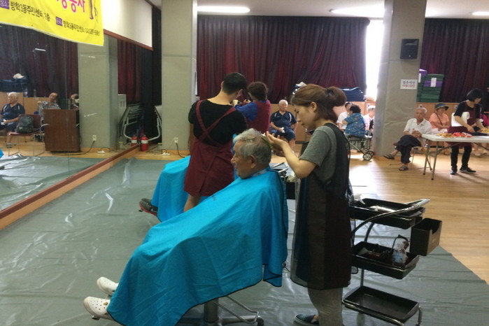 지난 1일 도봉구 방학3동 복지위원회는 주민센터 3층 대강당에서 지역내 노인 31명을 대상으로 이·미용 봉사활동을 실시했다. 사진은 자원봉사자가 노인의 머리를 다듬어주고 있는 모습.(사진제공=도봉구청)