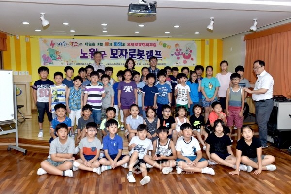 지난 3일 김성환 서울 노원구청장은 청계초교에서 열린 '노원구 모자로봇창의교실 개강식 및 학부모 간담회'에 참석했다. 사진은 김 구청장(맨 뒷줄 오른쪽)과 관계자들이 기념촬영하는 모습.(사진제공=노원구청)