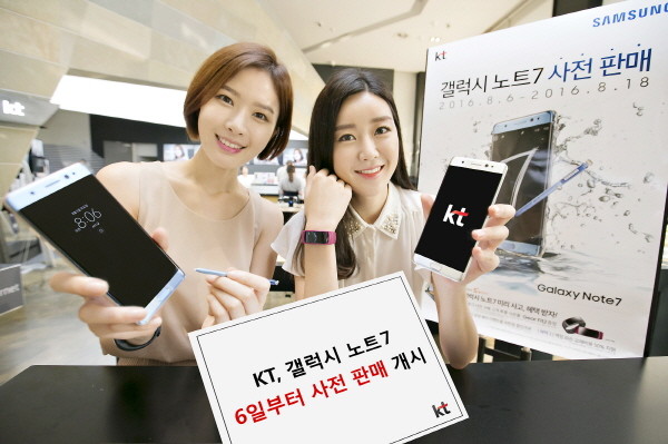 | ▲KT 홍보 모델들이 6일부터 시작되는 갤럭시노트7 사전 판매 개시를 소개하고 있다. | ||