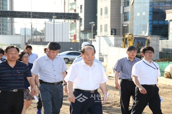 지난 4일 박홍섭 서울 마포구청장은 경의선 책거리 조성 공사가 진행중인 경의선 홍대역사 사업부지를 방문, 현장탐방을 실시했다. 사진은 박 구청장(가운데)이 공무원들 및 사업 관계자들과 현장을 둘러보고 있는 모습.(사진제공=마포구청)