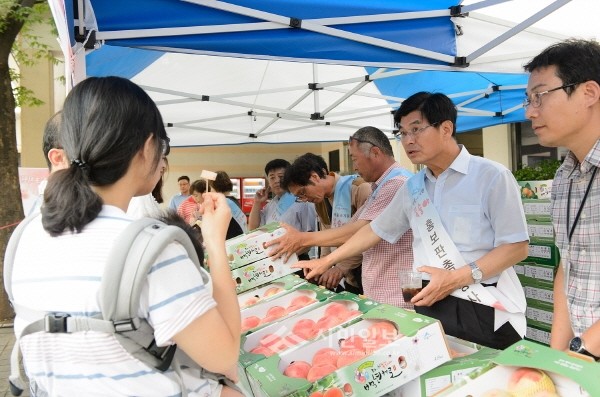 지난 3일 세종시는 서울 여의도에 위치한 국회 후생관 마당에서 세종조치원 복숭아 판촉전을 열었다. 사진은 이춘희 시장(오른쪽에서 두번째)이 시식을 하러 온 시민들에게 설명을 하고 있는 모습.(사진제공=세종시청)
