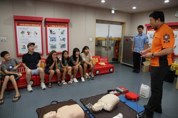 지난 4일 서울 동작소방서는 휴가를 앞둔 초등학생을 대상으로 물놀이 안전사고 예방교육을 실시했다. 사진은 소방관이 심정지 환자 발생 시 심폐소생술 등 응급처치 법에 대해 설명하는 모습.(사진제공=동작소방서)