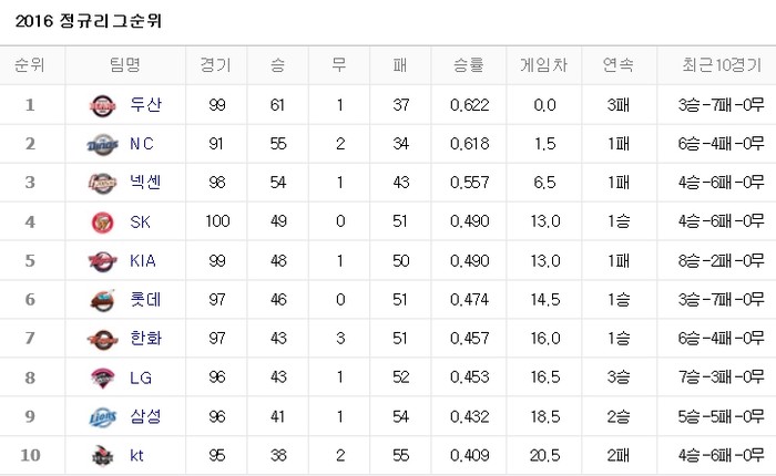 프로야구의 계절이 찾아왔다. 과연 프로야구순위가 궁금하다. 프로야구 순위집계 결과 두산이 99경기 61승으로 1위다.