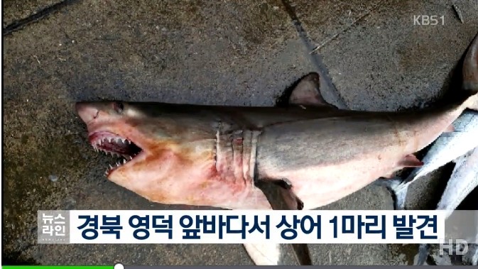 지난 4일 새벽 5시 30분쯤 경북 영덕군 앞바다에서 150센티미터 길이의 상어 한 마리가 어선이 쳐둔 그물에 걸렸다.