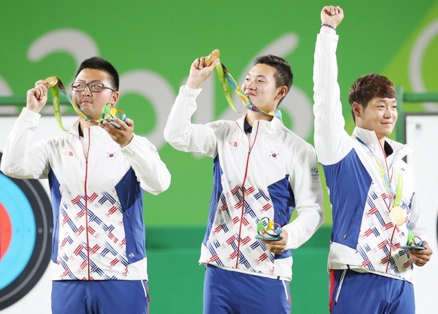 6일 오후(현지시간) 브라질 리우데자네이루 삼보드로모 경기장에서 열린 2016 리우올림픽 남자양궁 단체전 결승에서 미국을 꺾은 김우진(왼쪽부터), 구본찬, 이승윤이 시상식에서 교민 응원에 화답하고 있다.