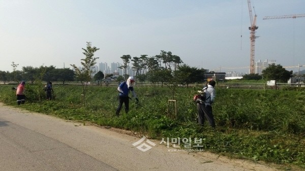 최근 경기 김포시 사우동 주민센터는 계양천 사우교 인근 벚나무 식재지를 대상으로 제초작업을 실시했다. 사진은 환경미화원들이 제초작업을 진행하는 모습.(사진제공=김포시청)
