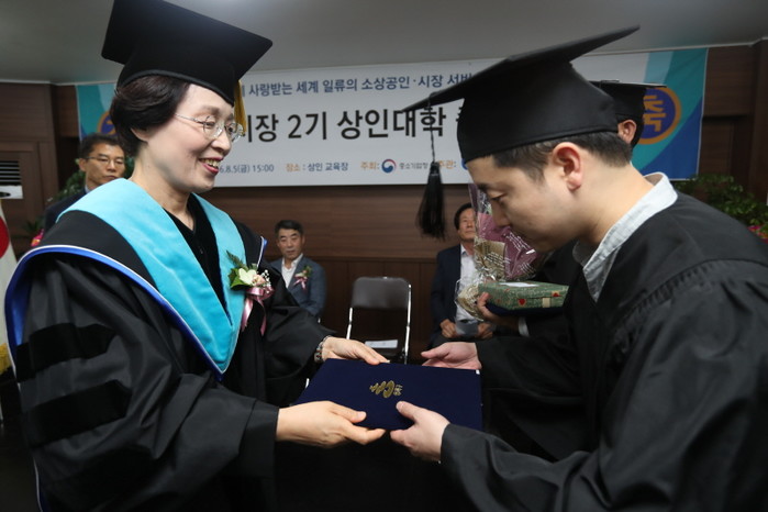 지난 5일 박춘희 송파구청장은 방이시장 상인회사무실에서 열린 방이시장 제2기 상인대학 졸업식에 참석해 졸업장을 수여하고 인사말을 전했다. 사진은 박 구청장(왼쪽)이 졸업자에게 졸업장을 전달하는 모습.(사진제공=송파구청)