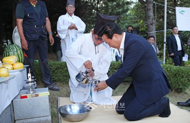 | ▲ '산치성제'에 참석한 조동탁 의장이 제를 올리기 위해 술을 받고 있다.(사진제공=강동구의회) | ||